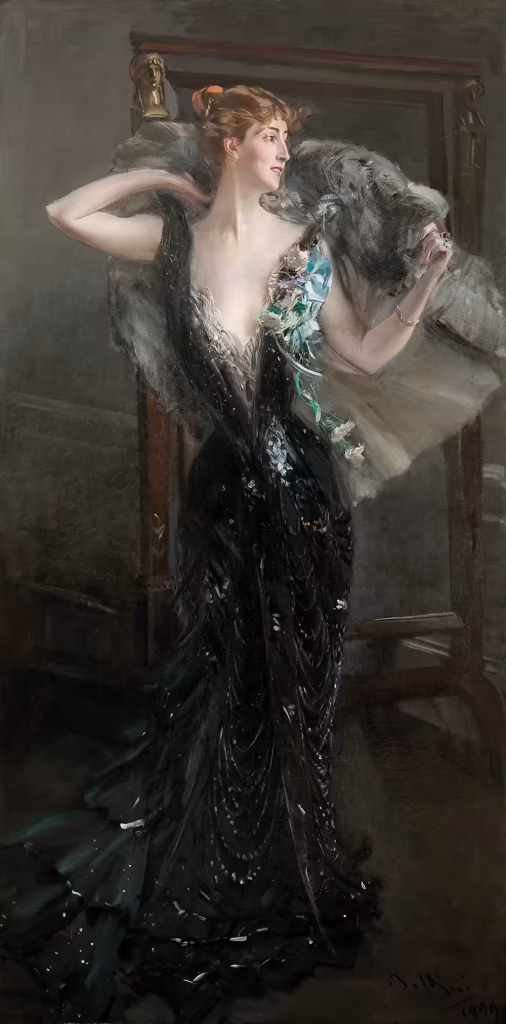 Il suo stile inconfondibile si distingue per pennellate rapide e sinuose, impresse sulla tela come vere e proprie “sciabolate”, capaci di conferire vita e sensualità. La pittura di Boldini anticipa le avanguardie del Novecento, restando fedele a una ricerca estetica che trasforma l’abito in un’estensione del carattere e il colore in uno strumento psicologico.