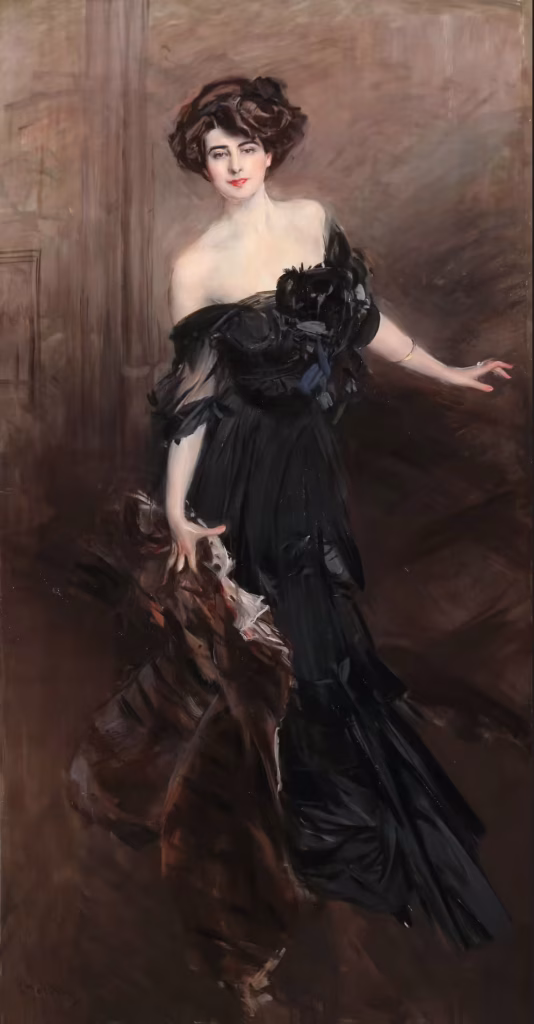 - Ritratto di signora con ventaglio nero di piume: icona delle “divine” ritratte a grandezza naturale. Esempio perfetto della capacità di Boldini di rendere i “neri” profondi e i materiali preziosi, trasformando un accessorio in un’estensione della personalità della donna.