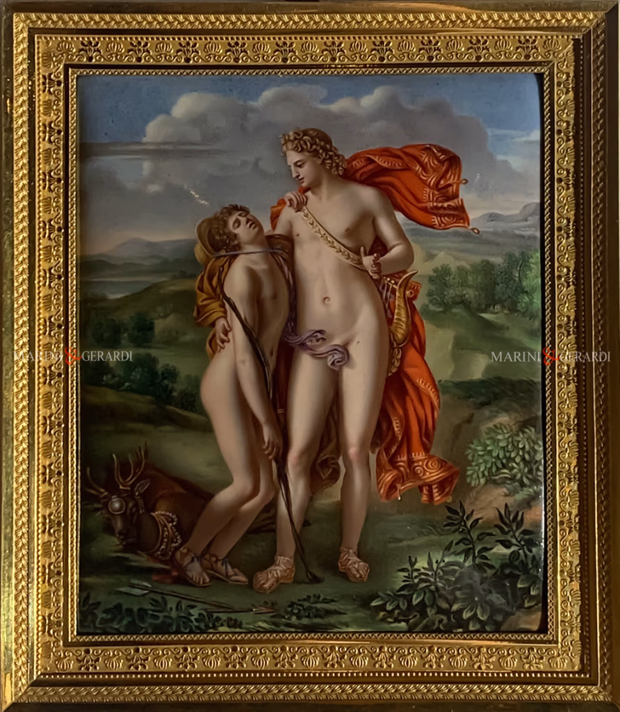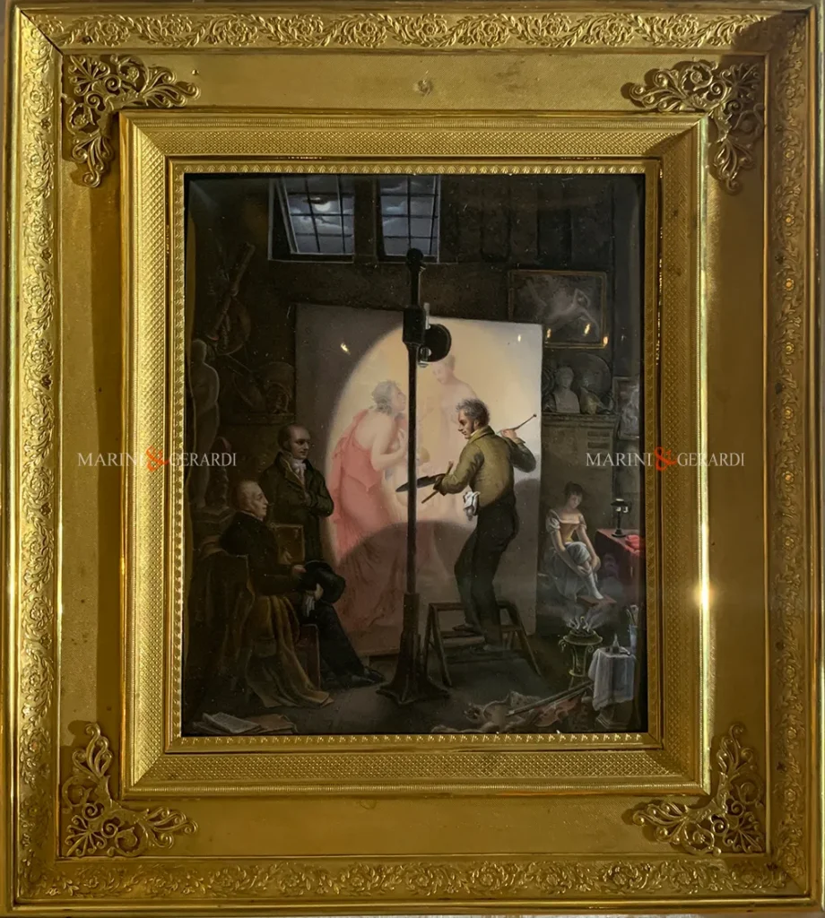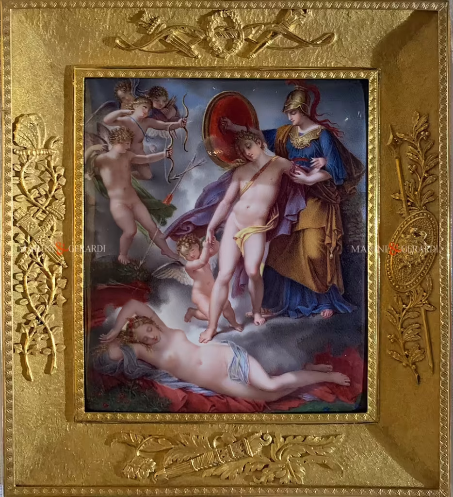 Queste miniature furono realizzate all’inizio del XIX secolo da alcuni dei più noti smaltisti francesi dell’epoca, tra cui Jean-Baptiste Isabey e Jean-Baptiste Weyler, autori capaci di tradurre in scala ridotta la potenza evocativa dei capolavori di David, Gérard, Appiani e altri grandi pittori neoclassici. La tecnica dello smalto su rame, già nota in epoca rinascimentale e barocca per oggetti devozionali o decorativi, in questo caso fu elevata a medium artistico colto e intellettuale, destinato a una fruizione tanto privata quanto appassionata.