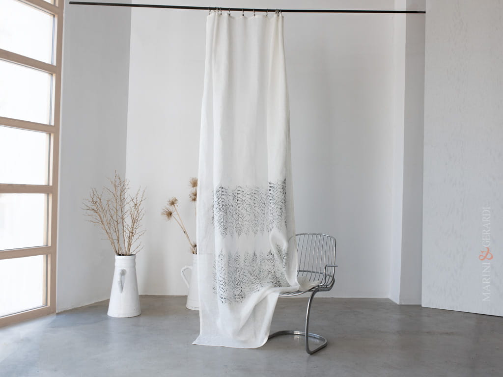 La verticalità degli alberi disegnati su AURA ha un potere psicologico: slancia le altezze e apre i confini della stanza. La doppia nuance di colori si fonde con la trama del lino e permette alla luce di penetrare in modo netto, e che rappresenta il suo punto di forza.