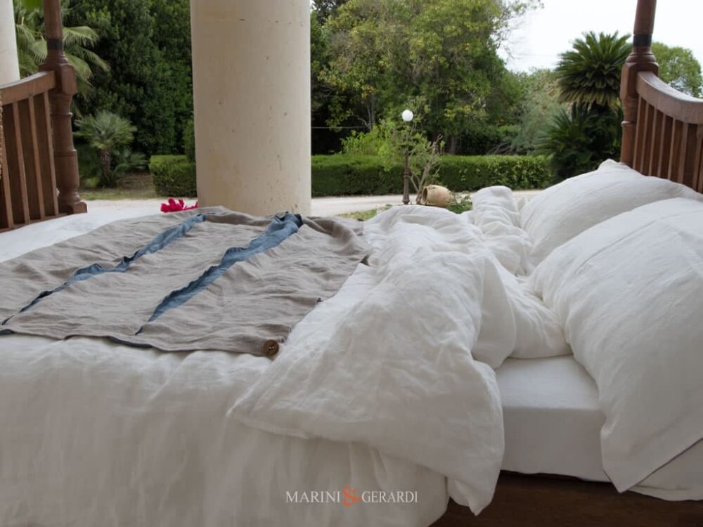 Il nostro sacco copripiumino è un autentico capolavoro di manifattura artigianale, realizzato con tessuto 100% lino italiano di primissima qualità, nella pratica versione No Stiro. La chiusura con bottoni e patella assicura una perfetta vestibilità, mentre il sovra pannello in lino grezzo, applicato con bottoni, aggiunge un dettaglio distintivo con aperture a taglio orizzontale e inserti a contrasto.
