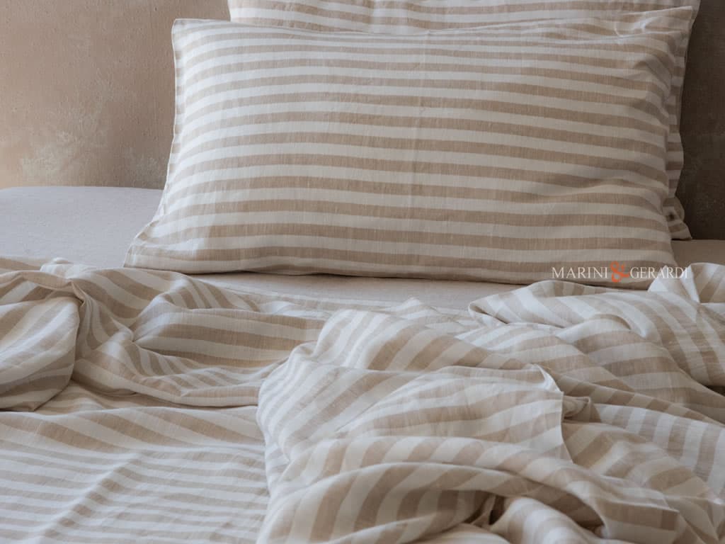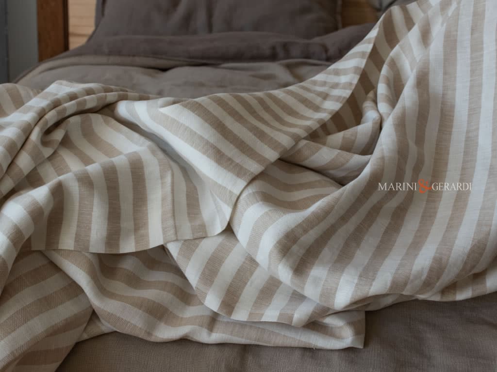 SAHARA – Lenzuolo Sopra in morbido Lino di Altissima Qualità, Design a righe strette. Tessuto tinto in filo con colori Indantrene particolarmente stabili alla luce del sole e ai lavaggi.
