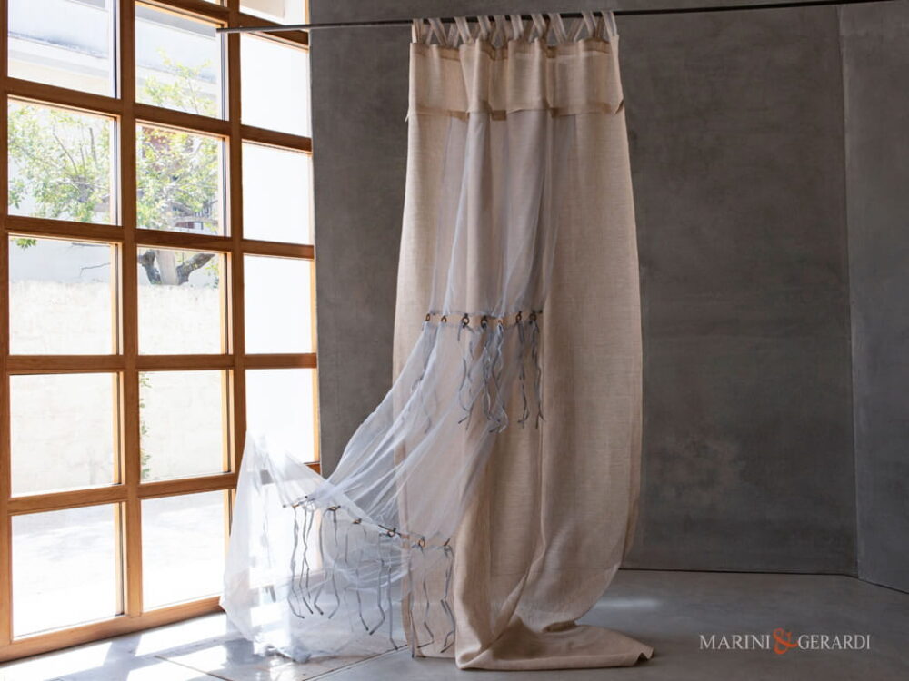 Tenda realizzata con tessuto in puro lino canapone, con doppio telo in organza dalle trasparenze delicate.