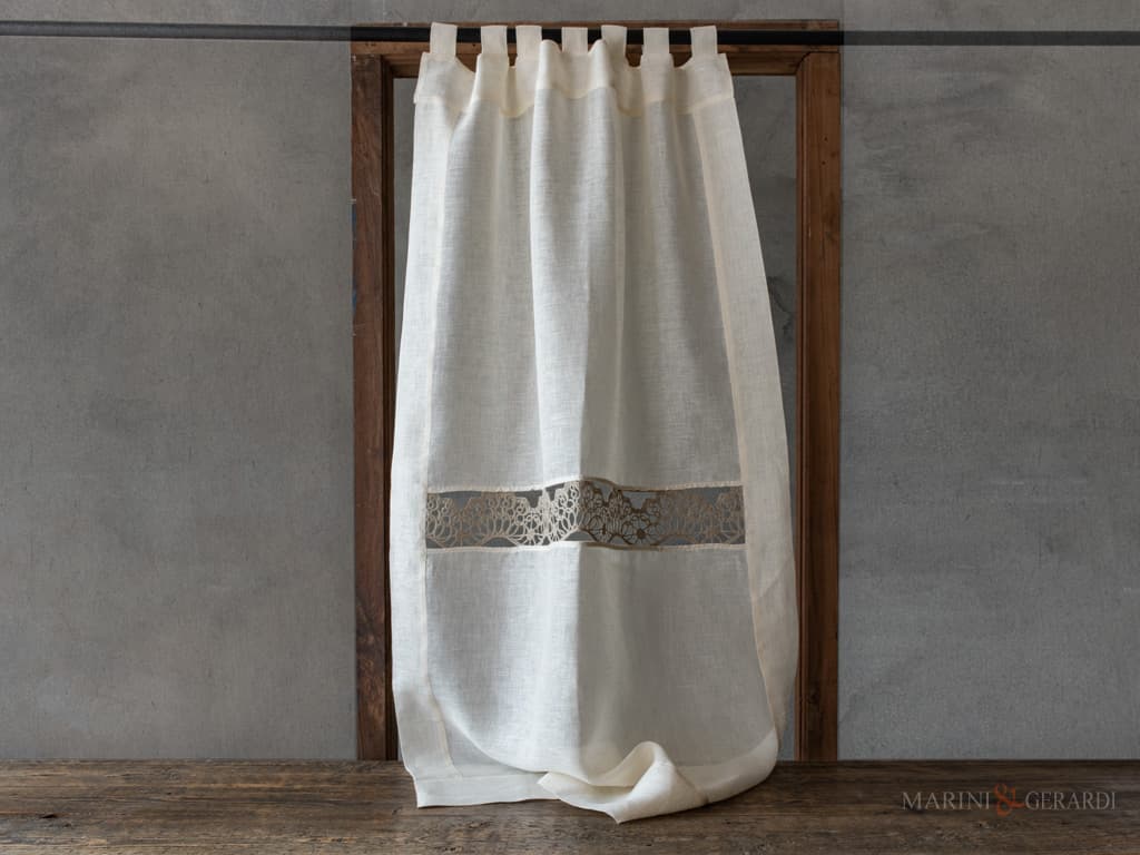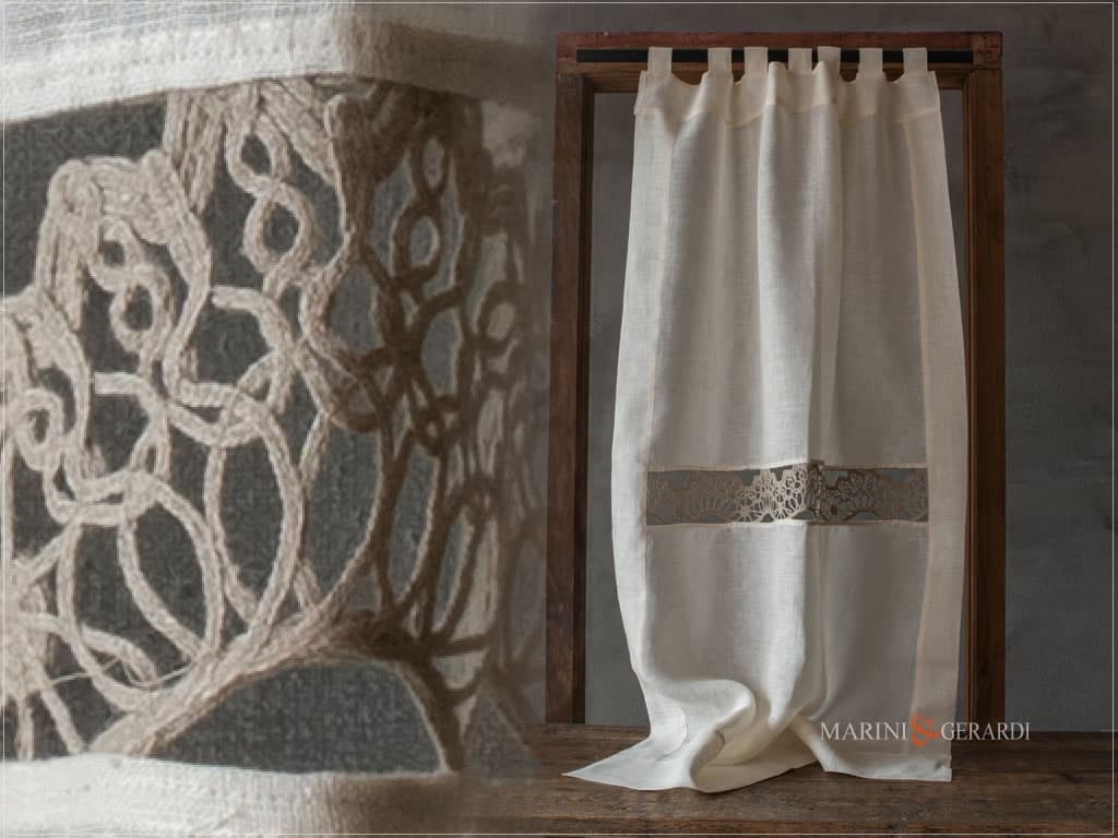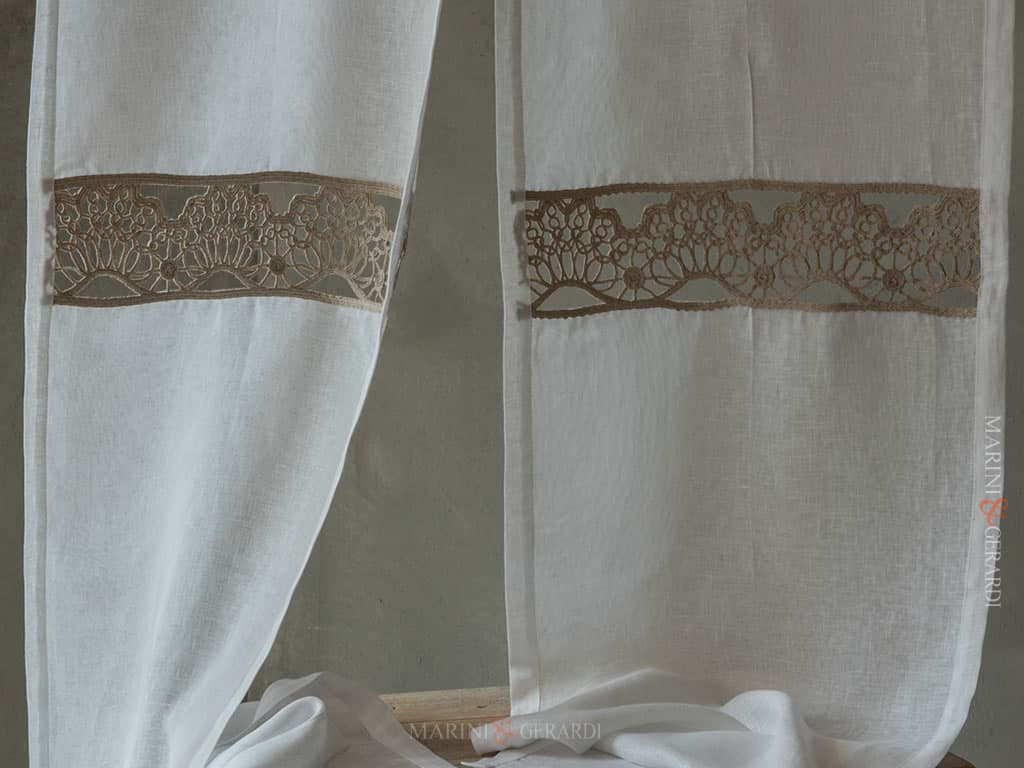 Realizzate in puro lino, per un look Classico ma adatto anche ad un ambiente Moderno. SOLETO (mini) Tende a Vetro Camera da Letto con Tessuto e passamaneria in Lino.