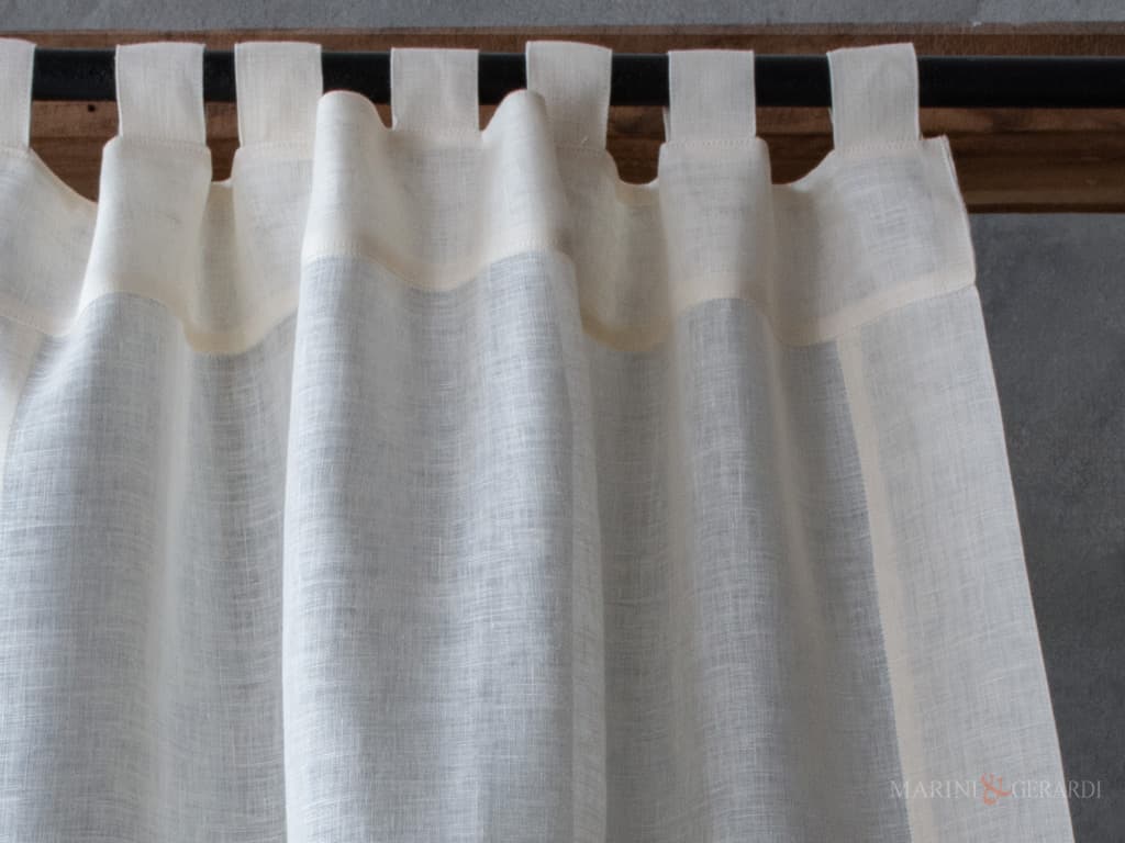 Tende a vetro camera da letto realizzate con tessuto in puro lino in combinazione con una fascia di passamaneria realizzate artigianalmente in esclusiva; inoltre la trama del tessuto: trasparente e delicato rendono bello, piacevole ed elegantemente unico il risultato finale.
