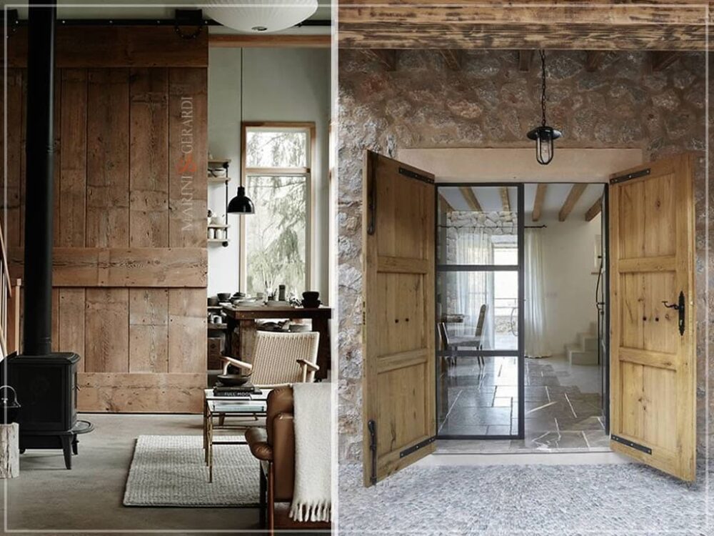 Queste porte hanno un design strutturale rustico, con plance di legno massello che creano un effetto informale dal sapore vissuto. La finitura del legno può variare dal naturale allo sbiancato fino ad arrivare a tonalità scure, a seconda del contesto dell’ambiente.
