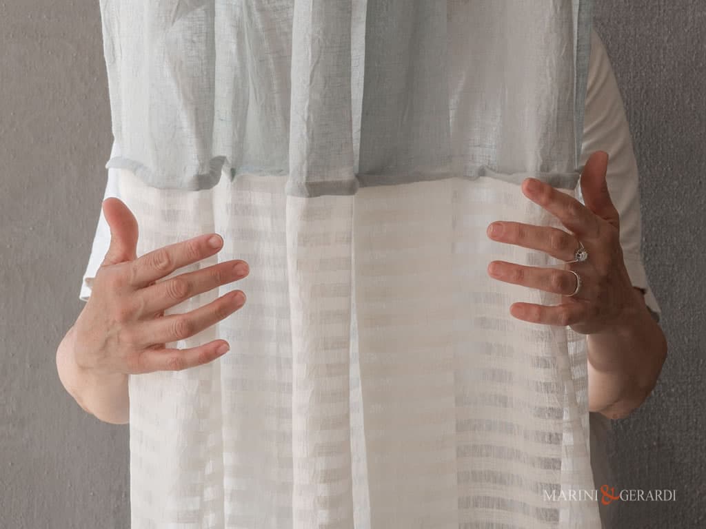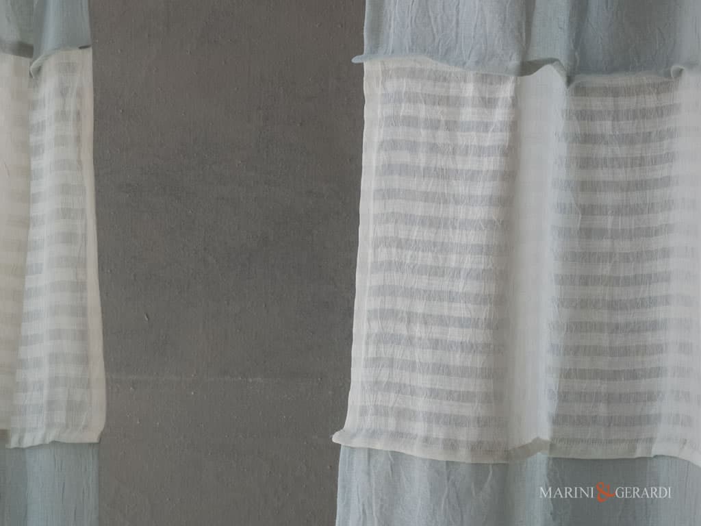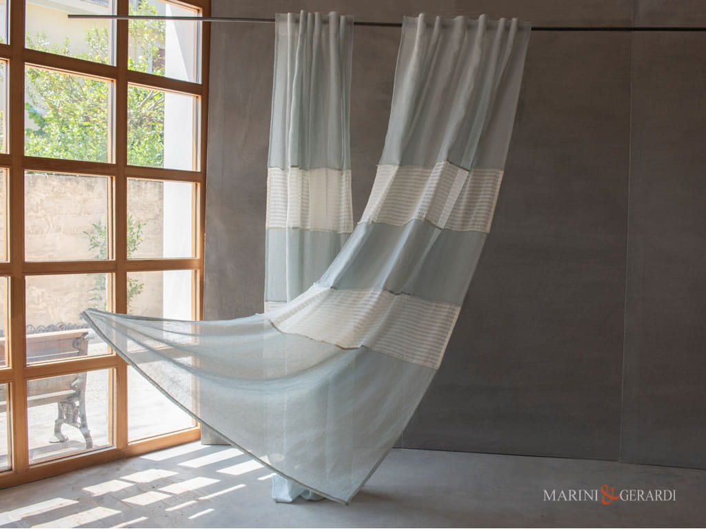Tenda da interno realizzata con una combinazione di tessuti in puro lino di primissima qualità dalle trasparenze delicate.