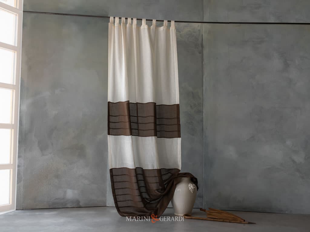 MONTESARDO – Tende di lino moderne da interni per un look innovativo ed essenziale senza eccessivi  fronzoli: il modello ha una grande balza ed un motivo centrale con plissettature.