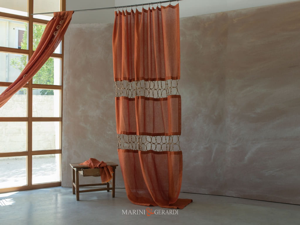 Tenda realizzata con tessuto in puro lino tinto in filo, di primissima qualità a trama fitta dalle trasparenze delicate.