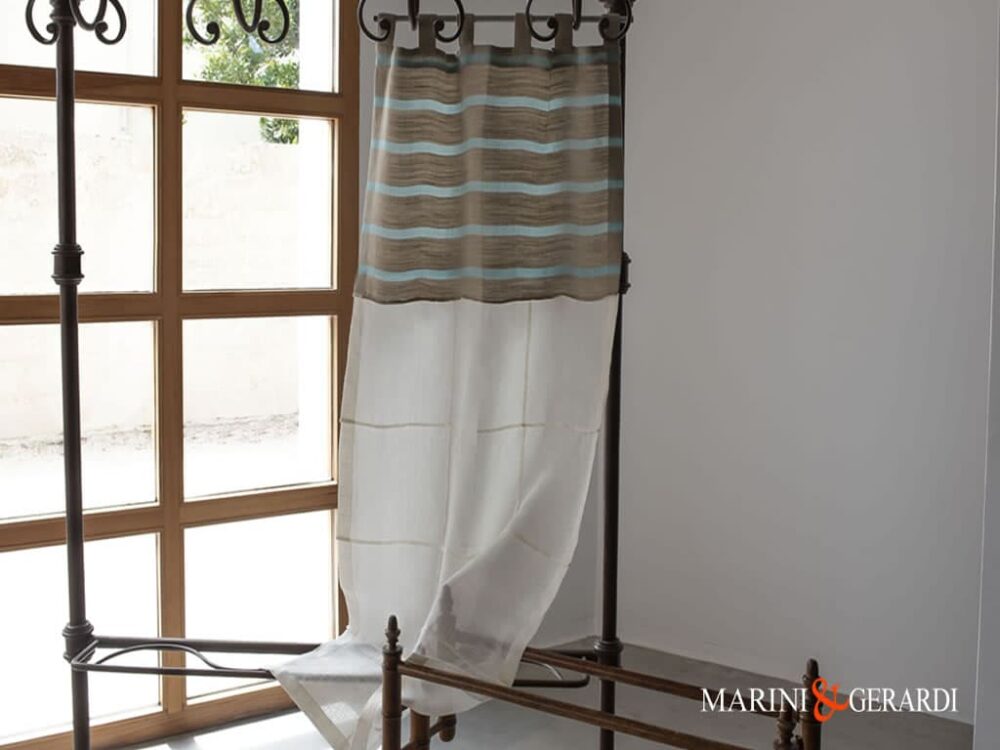 Tenda doppio corpo realizzata con una combinazione di tessuti in lino tinto in filo, di primissima qualità a trama fitta dalle trasparenze delicate. Tessuto morbido e piacevole al tatto.